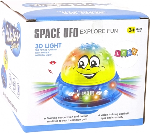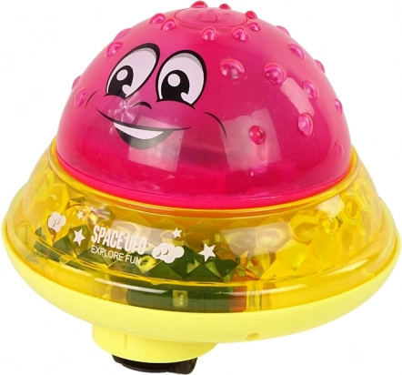 Wodna piłeczka UFO to dwuczęściowa zabawka, która działa w dzień i w nocy. Ma różowy kolor z otworami na górze, z których tryska woda, gdy jest zanurzona. Po kąpieli zabawka może zostać przeniesiona do pokoju, gdzie czeka ją mała podstawka w kształcie latającego talerza. Po połączeniu powierzchni piłeczki i talerza aktywuje się wesoła muzyka i kolorowe diody, tworząc małą domową dyskotekę.