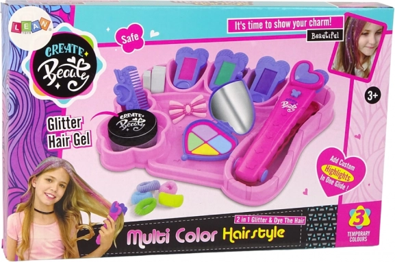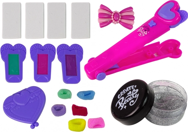 Oprócz kolorowych pasemek fryzurę można wzbogacić dodatkowymi akcesoriami z zestawu, takimi jak kolorowe gumki, spinka w kształcie kokardki, grzebień, wymienne gąbeczki do prostownicy i żel z brokatem. Wszystko jest uporządkowane dla komfortowej i wygodnej zabawy.