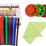 W zestawie są 3 dyski (24 motywy), 12 kolorowych flamastrów, zeszyt i gąbka do czyszczenia – wszystko, czego mały artysta potrzebuje.