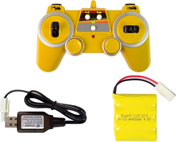 W zestawie znajdziesz model, pilot zdalnego sterowania, akumulator 4,8 V, ładowarkę USB i instrukcję. Wystarczy dodać 2× baterie AA do pilota.