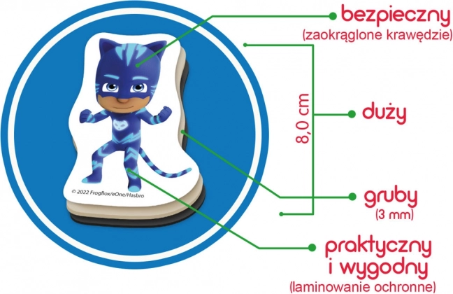 Z tym wesołym zestawem magnesów z motywami ulubionych bohaterów z PJ MASKS dzieci mogą tworzyć nieskończone opowieści według własnej wyobraźni. Magnesy są lekkie, trwałe i dzięki zaokrąglonym krawędziom bezpieczne także dla mniejszych rączek. Świetnie sprawdzą się na lodówce, tablicach magnetycznych i metalowych powierzchniach w pokoju dziecięcym.