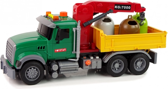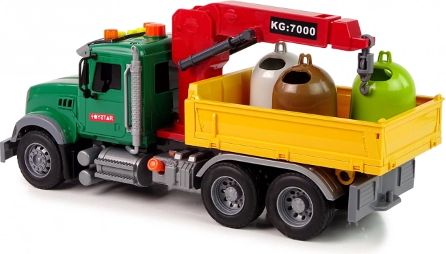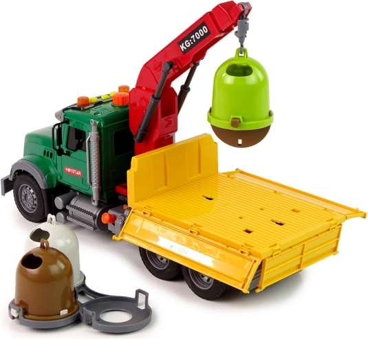 Ten szczegółowo opracowany samochód komunalny przewiezie wszystko, co potrzebne – od dołączonych kontenerów po drobne zabawki. Tylny przyczep jest wyposażony w ruchomy dźwig, który łatwo podnosi i odkłada kontenery. Na dachu kabiny znajdziesz przycisk sterujący do aktywacji ramienia dźwigu i efektów.