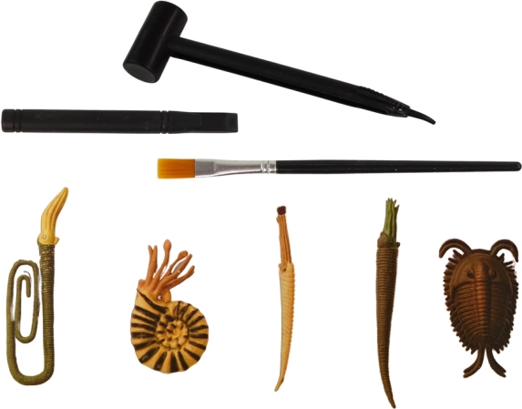 - 1 starożytne stworzenie (losowy gatunek), dłuto, pędzelek, młoteczek, gips, gąbka w kształcie dinozaura