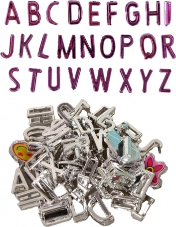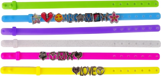 Zawiera literki od A do Z, różne kształty oraz 6 pasków do bransoletek z prostym zapięciem.