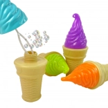 Zabawka sprawdzi się podczas wyjątkowych okazji lub do wspólnej zabawy w ogrodzie. Pojemnik ma kształt lodów. Płyn w środku jest bezbarwny, wystarczy wyjąć patyczek, dmuchnąć lub delikatnie przeciągnąć, a naszym oczom ukażą się kolorowe bańki.