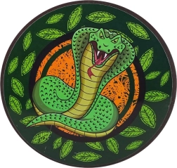 - Wyrazisty design: zielony wąż na tarczy i mieczu