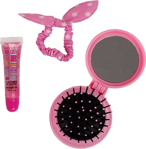 - Zawartość zestawu: składana szczotka z lusterkiem, gumka do włosów z kokardką, 3× pędzelek, błyszczyk do ust, róż, cienie do powiek