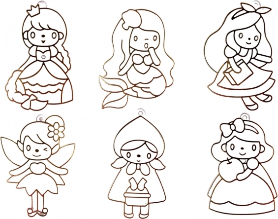 Sześć przezroczystych motywów księżniczek gotowych do kolorowania zamieni każde popołudnie w kreatywną pracownię i rozświetli okna lub plecaki oryginalnymi zawieszkami.