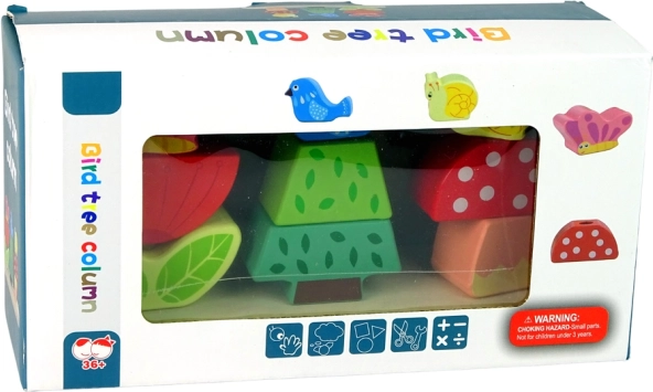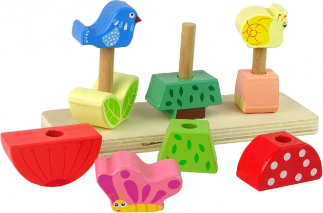 Ta drewniana układanka składa się z solidnej podstawy z trzema kołeczkami, na które dzieci nakładają drewniane elementy w dowolnej kolejności tak, aby do siebie pasowały. Elementy przedstawiają rośliny, motyle i ptaki – zadaniem jest prawidłowe przyporządkowanie ich do naturalnego środowiska, na przykład motyla do kwiatu czy ptaka do drzewa. Układanka rozwija wyobraźnię oraz wiedzę o przyrodzie.