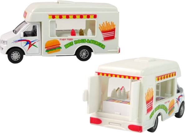 W zestawie znajdziesz dwa modele kamperów. Jeden działa jako lodziarnia, drugi jako fast-food. Zostań kierowcą, który ucieszy każde dziecko pysznym jedzeniem. Kampery są w kolorze białym, uzupełnione charakterystycznymi naklejkami dla każdego modelu.