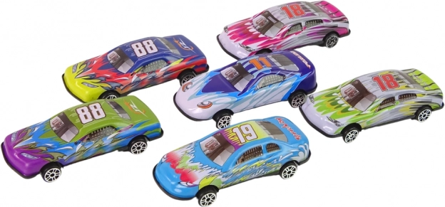 Sześć kolorowych aut wyścigowych, każde z unikalnymi wzorami i numerami, przeznaczonych do zabaw wyścigowych.