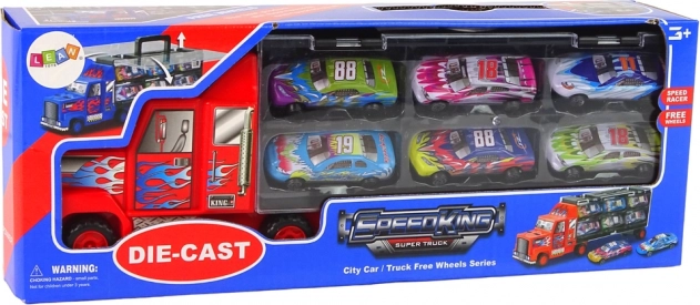 Każde dziecko pokocha zabawę ciężarówkami i autami. Ten zestaw zawiera dużą ciężarówkę, która w naczepie przewozi sześć sportowych samochodów. Pojazdy są zaprojektowane tak, by wygodnie mieściły się w dziecięcej dłoni, a ich wyraziste kolory i wyścigowe naklejki przyciągną uwagę każdego malucha.
