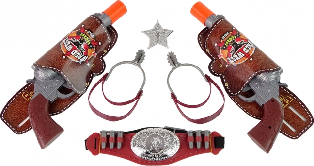 Pas z kaburami, dwa rewolwery, odznaka szeryfa i kajdanki – wszystko, czego dziecko potrzebuje do emocjonujących zabaw w Dziki Zachód.
