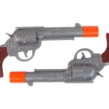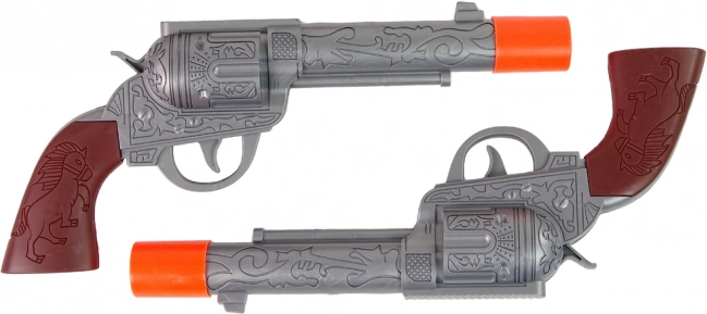 Plastikowe pistolety z pomarańczowymi końcówkami i dźwiękiem wystrzału po naciśnięciu spustu zwiększają realizm zabawy, dbając jednocześnie o bezpieczeństwo.