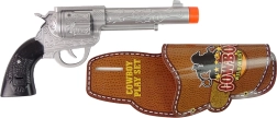 Lekki rewolwer (23 × 10 × 4 cm) wygodnie leży w dłoni, a dzięki kaburze na pasku jest zawsze pod ręką. Bezpieczna pomarańczowa końcówka jasno pokazuje, że to zabawka.