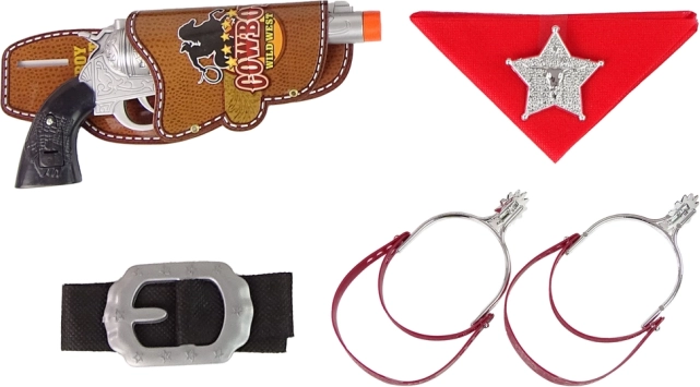 Odznaka szeryfa, czerwona chustka, pasek z klamrą i kowbojskie ostrogi dodają zabawie stylu i pewności siebie. Idealne na karnawał i domowe przebieranki.