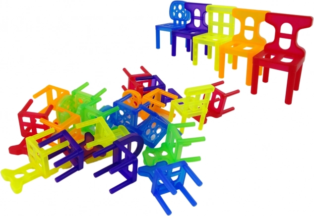 Krzesełka w sześciu wyrazistych kolorach wspierają rozróżnianie barw, trenują małą motorykę i umożliwiają układanie kształtów, wież oraz wzorów.