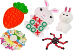 W opakowaniu łącznie 24 elementy: gra kółko i krzyżyk (tic-tac-toe), pop it marchewka, 4 figurki królików, spinner + spinner Happy Easter, 3 skaczące zabawki, 6 gumowych węży, antystresowy królik, 2 gniotki króliki, 4 pierścionki, 2 ściskane króliki, królik pop it z wypustką oraz 4 składane jajka. Dzięki kompaktowym wymiarom zestaw nadaje się w podróż i do przedszkola.