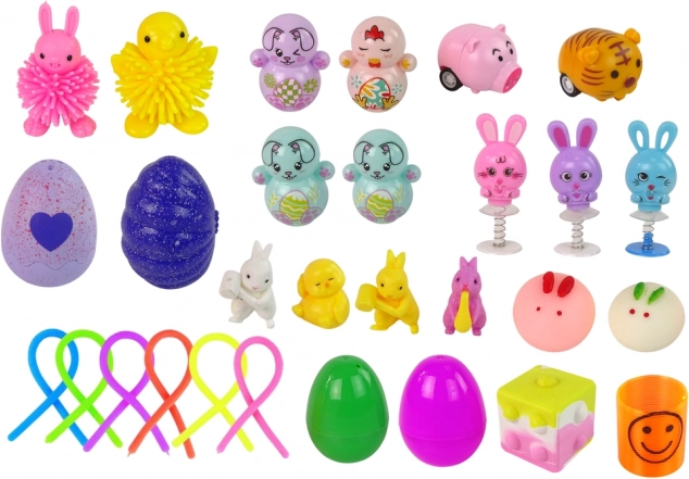 - kostka sensoryczna, kostka składana, 4 figurki (królik, kurczaczek), 6 plastikowych figurek (królik, kurczaczek), gra kółko i krzyżyk, 2 ściskane króliki, 6 gumowych węży, 3 skaczące zabawki, 2 niespodzianki w jajeczku, 2 autka z naciągiem (tygrys, prosiaczek), sprężyna, 2 otwierane układanki w jajeczku, 2 gumowe króliki–gniotki, zabawka rozwijająca, brelok królik pop it