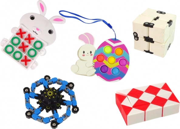 Kompletny zestaw od kostek przez pop it aż po skaczące zabawki. Idealna mieszanka do zabawy sensorycznej, nagród i prezentów do wielkanocnych koszyczków.