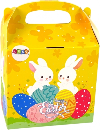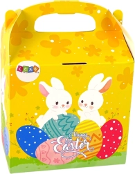 Praktyczne opakowanie prezentowe z króliczkami i jajkami, łatwe do przenoszenia dzięki uchwytowi. Idealny prezent dla dzieci na Wielkanoc.