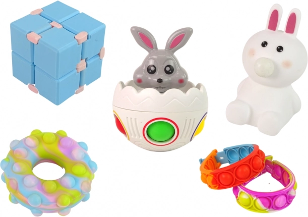 Pop it donut, bransoletki, króliczek i jajko, ściskane figurki oraz kostka fidget – idealne do zabawy sensorycznej i redukcji stresu.