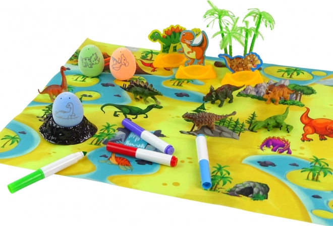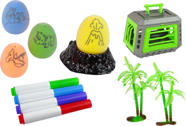 Stwórz własne jaja dinozaurów – na skorupkach znajduje się wzór, a dzieci mogą je pokolorować według wyobraźni. Dwa stojaki w kształcie wulkanu zapewniają stabilną ekspozycję.