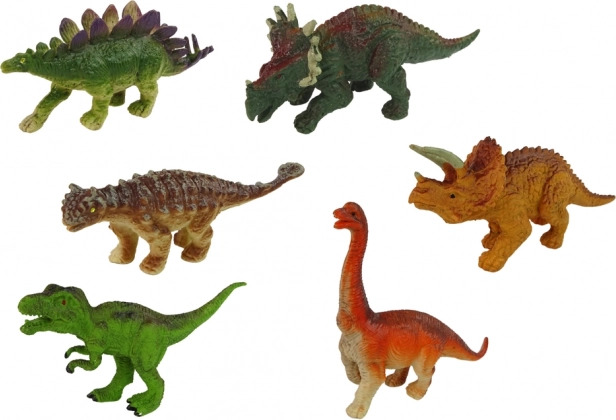 Sześć szczegółowych figurek z twardej gumy wiernie przedstawia różne gatunki dinozaurów. Idealne do zabawy i nauki o prehistorycznych stworzeniach.