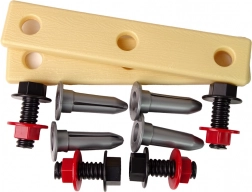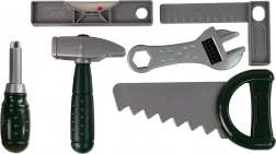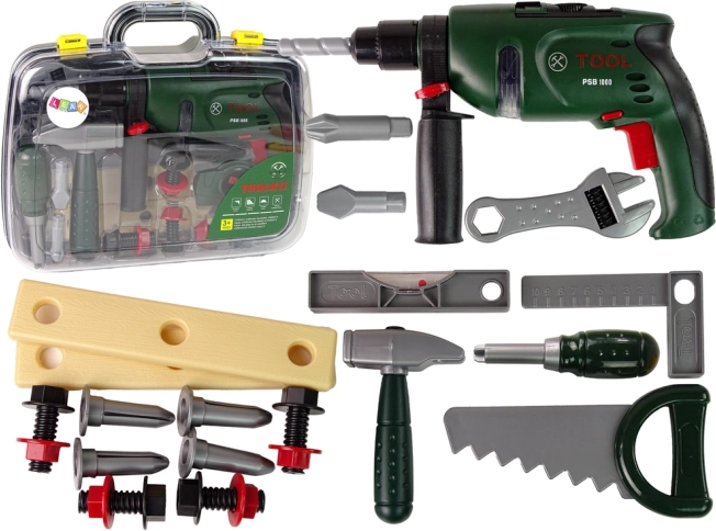 Zestaw zawiera: wiertarkę, młotek, piłę, klucz, śruby, nakrętki i drewnianą deskę do przykręcania elementów. Wszystkie narzędzia są wykonane z bezpiecznego plastiku, odpowiedniego dla dzieci od 3 lat.