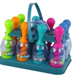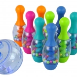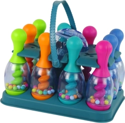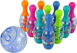.Kula do kręgli podczas rzutu świeci różnymi kolorami. W kręglach znajdują się kolorowe kuleczki, które po strąceniu wydają grzechoczący dźwięk.