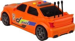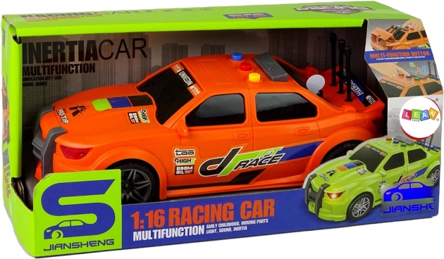 To stylowe auto wyścigowe w skali 1:16 zapewnia dzieciom radość z jazdy i atrakcyjne efekty. Po naciśnięciu przycisków słychać dźwięk rozruchu silnika oraz melodie, którym towarzyszą światła potęgujące atmosferę wyścigu. Dzięki napędowi frykcyjnemu wystarczy popchnąć autko, a ruszy płynnie do przodu.
