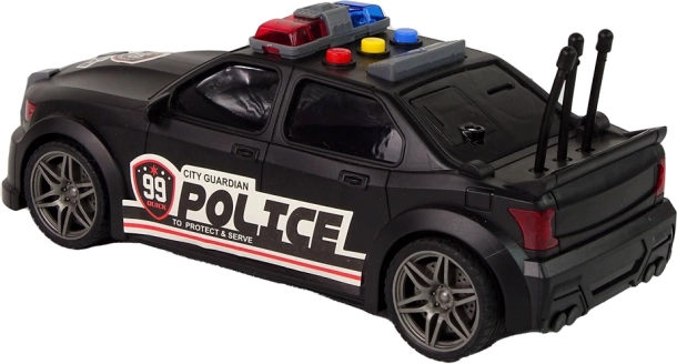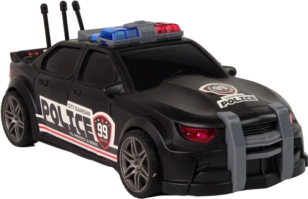 Czarne sportowe wykonanie z napisami POLICE, niebiesko-czerwonymi światłami ostrzegawczymi i antenami nadaje zabawce realistyczny wygląd.