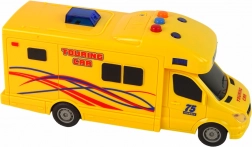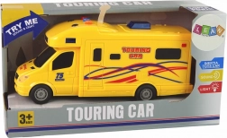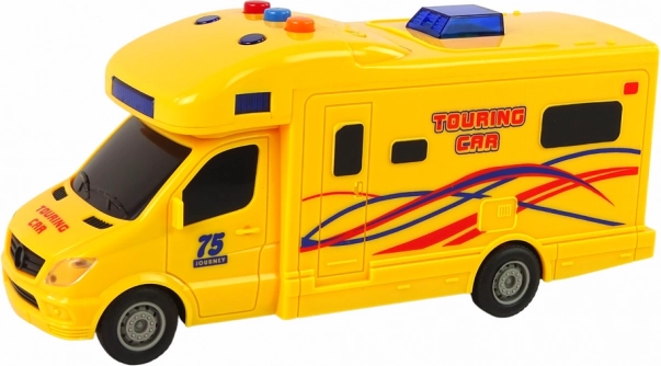 Żółty kamper dla dzieci przynosi porcję wakacyjnej zabawy na każdy dzień. Dzięki napędowi frykcyjnemu wystarczy docisnąć, pociągnąć do tyłu i puścić – a pojazd pomknie do przodu. Bardziej realistyczne wrażenia zapewniają efekty świetlne z niebieskimi diodami LED oraz efekty dźwiękowe startu, jazdy i cofania. Solidne wykonanie, gumowe opony i kompaktowe wymiary czynią z niego idealną zabawkę do domu i w podróż.