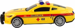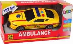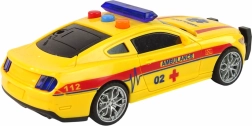 Szybka i solidna żółta karetka z wyraźnymi nadrukami „Ambulance” przeniesie dzieci prosto w centrum akcji ratunkowej. Po naciśnięciu przycisków zapalą się niebieskie diody nad kabiną i rozlegną się realistyczne dźwięki – rozruch silnika, klakson i sygnał ostrzegawczy. Dzięki napędowi ciernemu wystarczy docisnąć, pociągnąć do tyłu i auto samo ruszy do przodu.