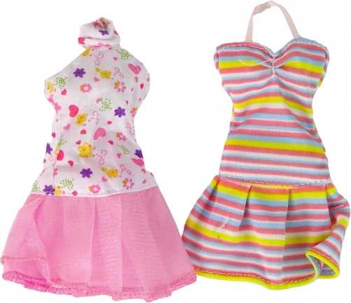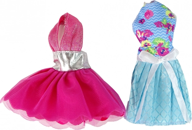 W komplecie znajdują się 4 wymienne sukienki (paskowa, różowa wieczorowa z brokatem, niebieska w kwiaty z kokardą, delikatna różowo-biała w kwiaty i serduszka), dwie torebki, kapelusz i zapasowe buty. Wszystko jest przejrzyście ułożone w prezentowym opakowaniu z okienkiem, które zachwyca od pierwszego spojrzenia.