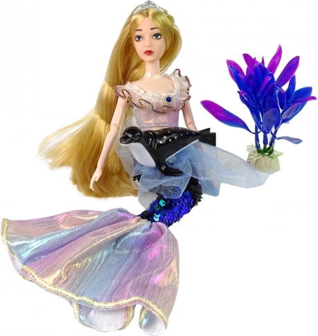 Odkryj magiczny świat z lalką Emily, syreną! Ma długie blond włosy, lśniącą tiarę oraz odwracalne cekiny na ogonie w zielono‑fioletowych odcieniach, które po przesunięciu zmieniają kolor na czarny. Ogon można zdjąć, więc dzieci mogą bawić się także jak klasyczną lalką. W zestawie urocze akcesoria – czarno‑biała figurka foki i roślinka akwariowa dla jeszcze bardziej fantastycznych opowieści.