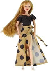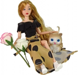 Lalka Emily ma na sobie elegancką czarną bluzkę i długą beżową spódnicę w grochy. Ma długie włosy idealne do czesania i tworzenia fryzur, realistycznie malowaną twarz z niebieskimi oczami i jest w pełni pozycjonowana dzięki stawom. W zestawie znajdziesz również urocze kociątko i dekoracyjne róże, które wzbogacą codzienne historyjki i zabawę w rodzinę.