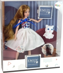 Odkryj elegancką lalkę EMILY z delikatnie czesanymi długimi włosami, nowoczesnym topem i białą spódnicą. Dzięki artykulowanym rękom i nogom dzieci łatwo ustawią ją w różnych pozach i stworzą własny pokaz mody. W zestawie znajduje się urocze białe kociątko, które dopełni każdą zabawową opowieść.