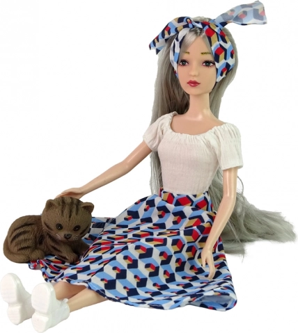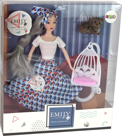 Odkryj urok lalki EMILY z długimi szarymi włosami, jasnymi niebieskimi oczami i dopasowaną opaską. Nosi biały top i rozkloszowaną spódnicę z geometrycznym wzorem, które uzupełniają białe buty. W zestawie znajduje się urocze kociątko oraz biała huśtawka – idealne do pomysłowych scenek i opieki nad pupilem.