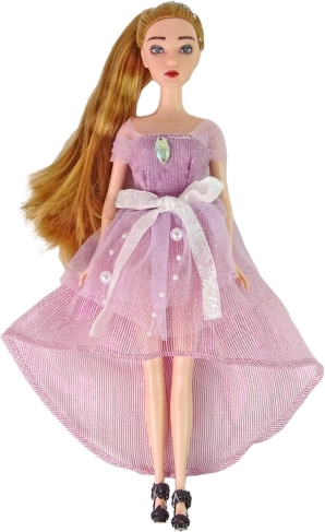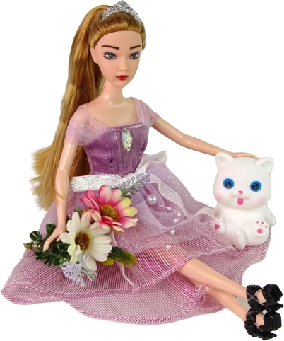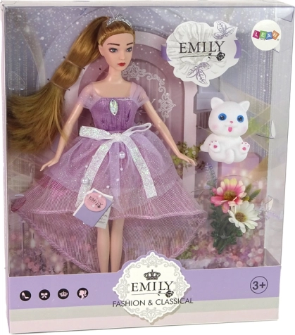 Wnieś do zabawy dziecka odrobinę magii z lalką Emily. Ma długie blond włosy związane w kucyk, nosi długą różową suknię z perełkami i kokardkami, na głowie tiarę, a na stopach eleganckie buty na obcasie. Zestaw uzupełnia biały kotek z niebieskimi oczami oraz dekoracyjne kwiaty.