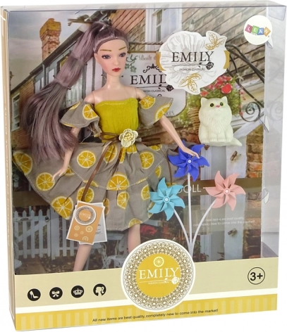 Odkryj czarujący zestaw do kreatywnej zabawy – lalka Emily z trzema wiatraczkami i uroczym kotkiem. Wspiera wyobraźnię, umiejętności społeczne i zapewnia niekończącą się zabawę. Lalka ma ruchome kończyny, długie włosy i sukienkę w cytrusowy wzór, a kotek po naciśnięciu wydaje piskliwy dźwięk.