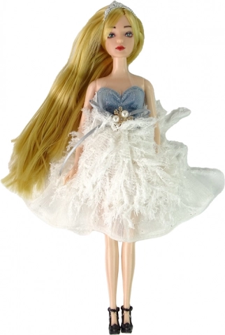 Błyszcząca biało-niebieska sukienka z koronką i perłowymi detalami, uzupełniona tiarą i stylowymi butami, zamieni EMILY w małą księżniczkę.