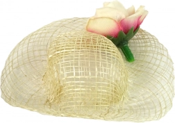 Beżowy kapelusz z kwiatem pięknie dopełnia kwiatową sukienkę z kokardką i kamyczkiem – doskonały look na każdą okazję.