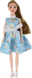 Laleczka Emily (30 × 7 × 4 cm) to delikatna towarzyszka kreatywnej zabawy. Ma długie włosy w odcieniach ciemnego blondu, które łatwo czesać i zdobić, zielone oczy oraz subtelny makijaż dla realistycznego wyglądu. Ubrana jest w uroczą niebieską sukienkę w kwiaty, z koronką, kokardką i kołnierzykiem, którą uzupełnia drobny „diamentowy” detal przy szyi oraz białe buciki.