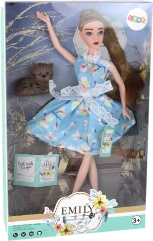 Laleczka Emily wiosenna z długimi włosami w niebieskiej sukience i z kociakiem