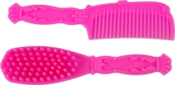 Brązowy koń ma piękne różowe siodło i długą grzywę, którą można czesać dołączoną szczotką i grzebieniem.