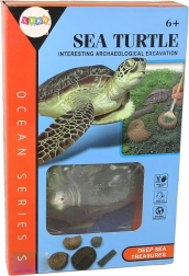 Kompletny edukacyjny zestaw dla miłośników podwodnego życia i archeologii. Wewnątrz realistycznej skamieniałości żółwia o wymiarach 14 cm x 11 cm znajdziesz ukryte wykopaliska, takie jak amonity.