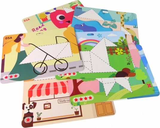 Zawiera plansze z zadaniami i instrukcje, które dostarczają dzieciom inspiracji do układania i rozwijania logicznego myślenia.