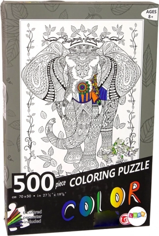 Zanurz się w świecie twórczej zabawy z 500 czarno-białymi elementami puzzli oraz 6 markerami do ich kolorowania. Ułóż obraz słonia otoczonego liśćmi i dumnie wyeksponuj go jako dekorację ścienną lub podkładkę na stół.