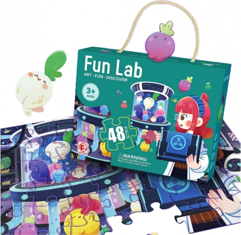 Zabawne puzzle dla dzieci z motywem laboratorium ze zwierzątkami, składające się z 48 elementów, rozwijają wyobraźnię, cierpliwość i motorykę małą. Elementy są duże (ok. 9 x 7 cm) i łatwo się je układa; gotowy obrazek ma 50 x 34 cm. Wysoka jakość wykonania zapewnia wielokrotne użytkowanie, odpowiednie od 3 lat, zgodne z EN 71.